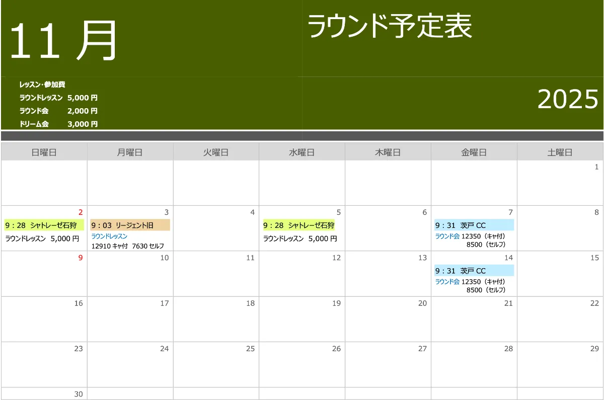 ●カレンダー内の金額はプレー料金です。